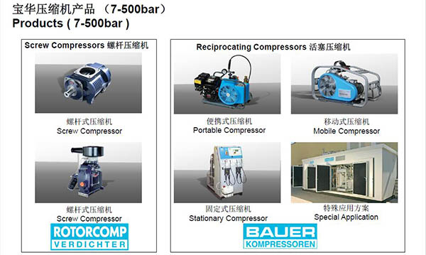 德國寶華(BAUER)壓縮機集團1946年成立于德國慕尼黑,有12間子公司,50多間銷售伙伴和280間維修服務(wù)中心。寶華集團是較早生產(chǎn)活塞式壓縮機的生產(chǎn)商。其銷售網(wǎng)絡(luò)很多,在世界各地的呼吸、消防、工業(yè)等領(lǐng)域成為了品牌。寶華與諸如寶馬集團等企業(yè)建立了良好的合作關(guān)系。在相關(guān)客戶里具有良好的口碑。