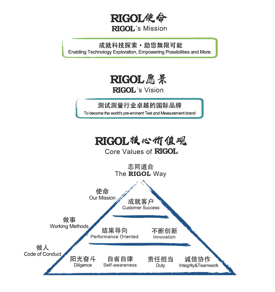 21年RIGOL秉承工匠精神,RIGOL作為全球測(cè)試測(cè)量行業(yè)的創(chuàng)新者,以“測(cè)試測(cè)量行業(yè)卓越的國(guó)際品牌”的愿景,推動(dòng)組織與團(tuán)隊(duì)一起達(dá)成公司使命,堅(jiān)持公司的核心價(jià)值觀。