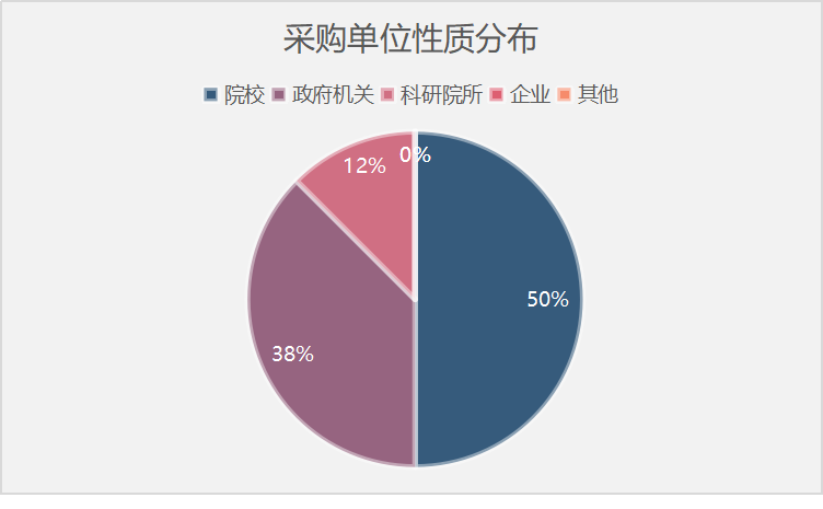 而從采購(gòu)單位性質(zhì)來看,院校和政府機(jī)關(guān)成為2020年電化學(xué)分析儀的采購(gòu)主力軍,分別占比50%和38%,而科研院校占比較少,僅為12%。與往年不同的是,企業(yè)在2020全年的電化學(xué)分析儀采購(gòu)中數(shù)量為0,較為少見。