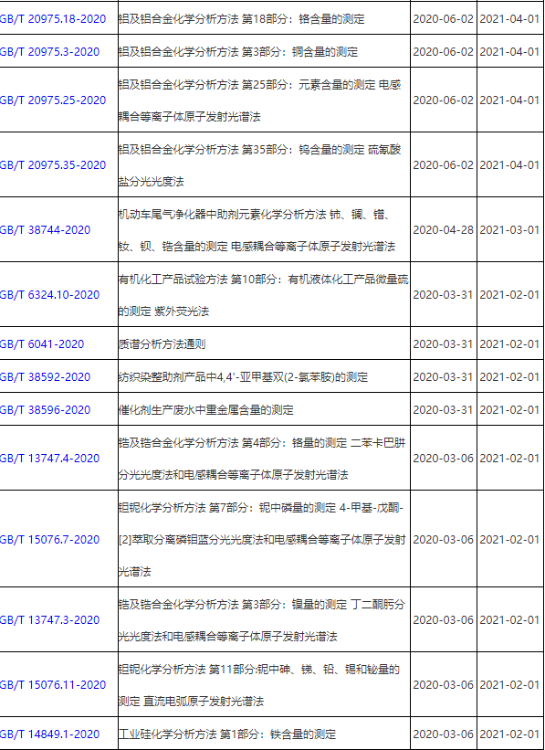 2021年上半年實(shí)施的分析檢測相關(guān)國家標(biāo)準(zhǔn)共52條,主要覆蓋有色金屬、農(nóng)業(yè)、天然氣、紡織等行業(yè)。涉及的儀器分析方法有氣相色譜-質(zhì)譜法、原子熒光光譜法、激光拉曼光譜法、電感耦合等離子體發(fā)射光譜法、火焰原子吸收光譜法等。