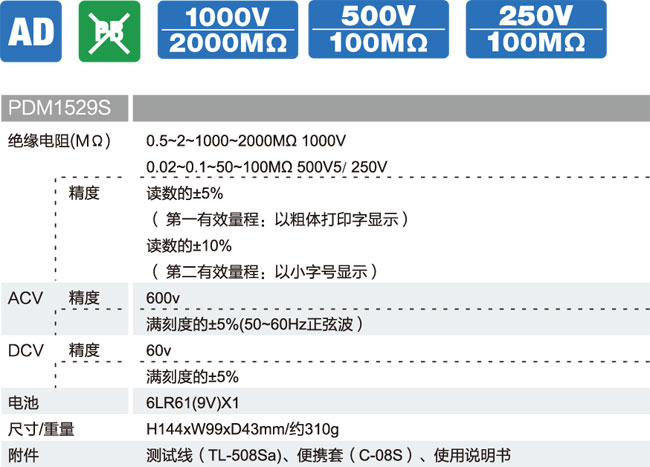 ■ 三個測試量程,測試電壓DC250V/500V/1000V