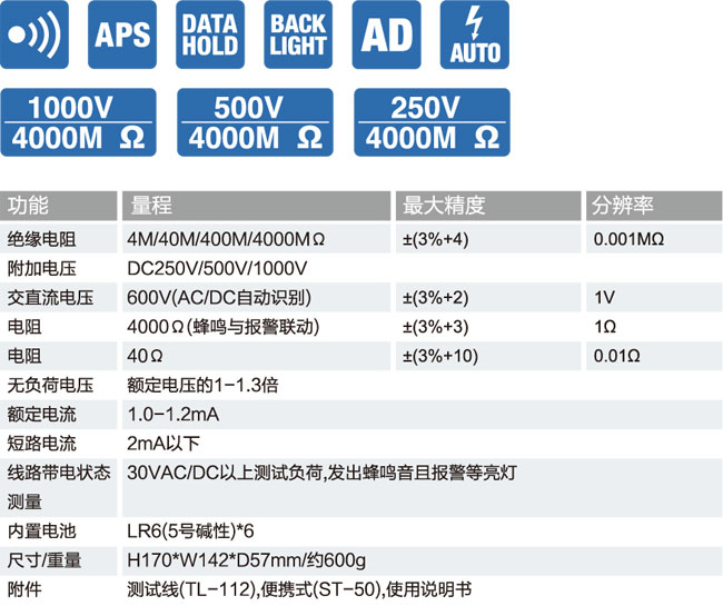 日本三和(sanwa)MG1000絕緣電阻測試儀,精良的設(shè)計,超值的手感,讓您更安全地測量絕緣電阻。廣泛用于測量發(fā)電機、馬達、電源變壓器、配線、電器和其它電氣裝置的絕緣電阻。顯示數(shù)值4000字的大屏幕液晶顯示屏,數(shù)字和模擬條雙顯示,LED背光,即使在光線較弱的位置也能有效讀數(shù),增強了可讀性。