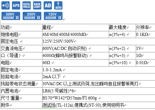 ■ 測(cè)量絕緣電阻時(shí)附加電壓為125V/250V/500V的3量程切換式