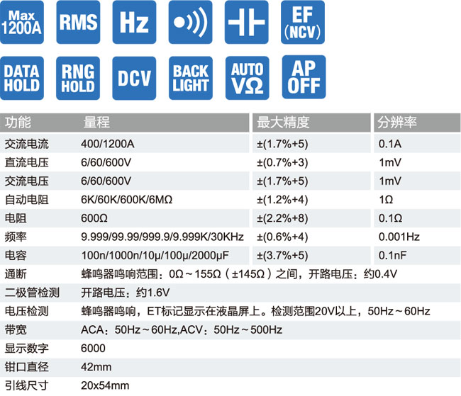 ■ 最大可測量交流電流1200A , 最高分辨率0.1A