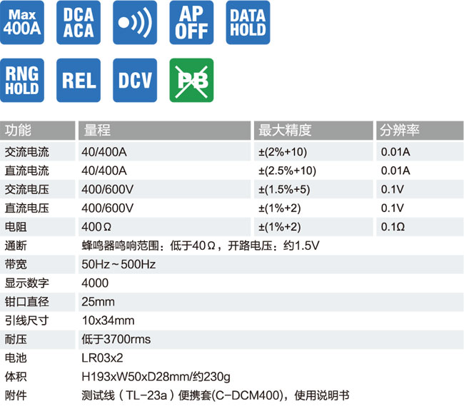 ■ 最大可測(cè)量交直流電流400A , 最高分辨率0.01A