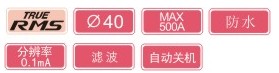 測定范圍 ? 精確度 | 交流電流 (50/60Hz) | 200/2000mA/20/200A/500A(真有效值) 讀數(shù)的 ±1.5%±6位(20/2000mA) 讀數(shù)的±2%±6(20/200A) 讀數(shù)的±2.5%±4位(500A) |