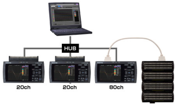 此外,使用PC進(jìn)行測(cè)量時(shí),通過連接多臺(tái)主機(jī)(最大10臺(tái)),可實(shí)現(xiàn)1臺(tái)機(jī)器控制最大500ch、或單獨(dú)進(jìn)行控制。