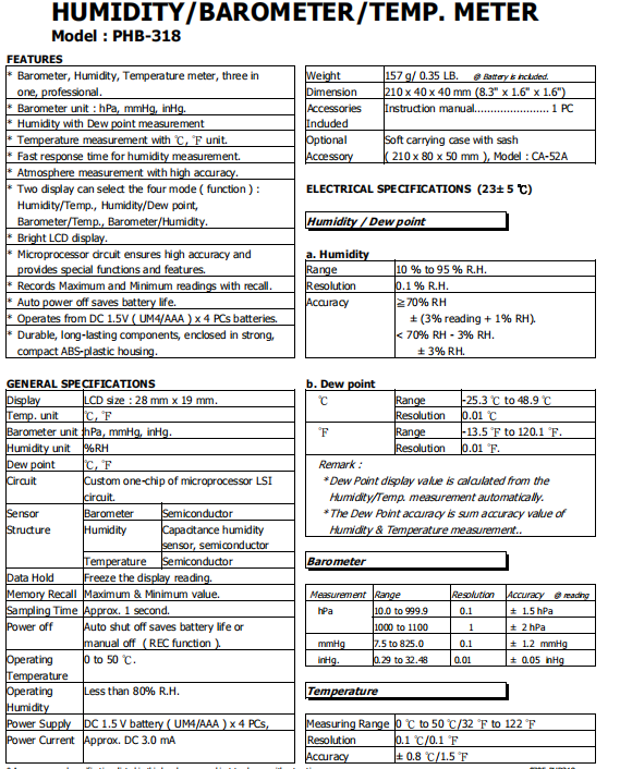 】自行對信息/圖片/參數(shù)等的真實性、準確性和合法性負責,本平臺(本網(wǎng)站)僅提供展示服務,請謹慎交易,因交易而產(chǎn)生的法律關系及法律糾紛由您自行協(xié)商解決,本平臺(本網(wǎng)站)對此不承擔任何責任。您在本網(wǎng)頁可以瀏覽【路昌LUTRON PHB-318 溫度|濕度|露點儀】有關的信息/圖片/價格等及提供