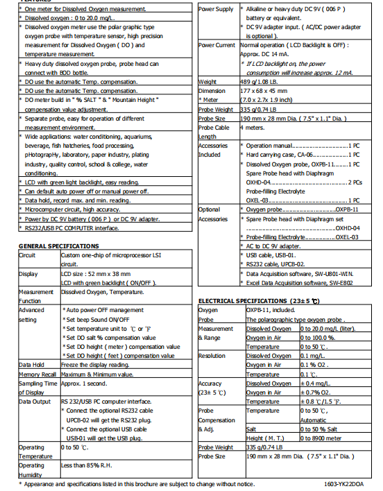 這一數(shù)字測(cè)氧儀提供一個(gè)包含臨時(shí)極譜式探頭。用于精密溶解氧的傳感器(做),溫度。測(cè)量。
