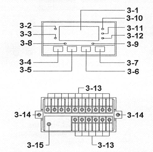 | 3-1顯示器 3-2 處理指示燈 3-3 設(shè)定指示燈 3-4 設(shè)定按鍵 3-5 ↓向下按鍵 3-6 ↑向上按鍵 3-7 功能按鈕 3-8繼電器控制指示燈 | 3-9 繼電器警示燈 3-10 RPM指示燈 3-11 ft/min指示燈 3-12 m/min指示燈 3-13 輸入端 3-14 固定孔 3-15 RS-232輸出端 |