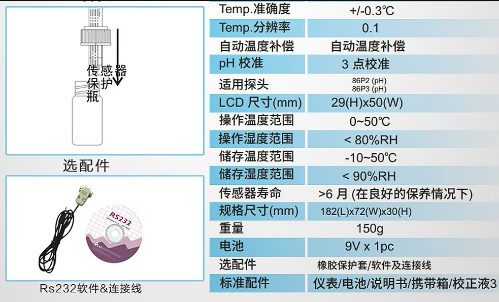 | 附件 | 9V電池、說明書、校正液 選購件:RS232軟件及連線 |