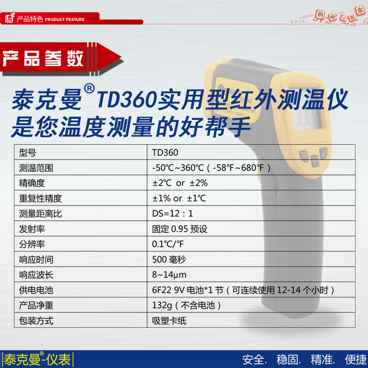 本網(wǎng)頁所展示的有關(guān)【泰克曼 TD360手持式紅外測溫儀|TD-360】的信息/圖片/參數(shù)等由的會員【泰克曼-深圳柏萊科技有限公司 】提供,由柏萊儀器網(wǎng)-專業(yè)銷售儀器儀表服務(wù)商-深圳柏萊科技有限公司會員【泰克曼-深圳柏萊科技有限公司 】自行對信息/圖片/參數(shù)等的真實性、準確性和合法性負責,本平臺(本網(wǎng)站)僅提供展示服務(wù),請謹慎交易,因交易而產(chǎn)生的法律關(guān)系及法律糾紛由您自行協(xié)商解決,本平臺(本網(wǎng)站)對此不承擔任何責任。您在本網(wǎng)頁可以瀏覽【泰克曼 TD360手持式紅外測溫儀|TD-360】有關(guān)的信息/圖片/價格等及提供 【泰克曼 TD360手持式紅外測溫儀|TD-360】的商家公司簡介、聯(lián)系方式等信息。