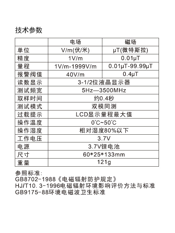 電磁輻射測(cè)試儀成功的將電場(chǎng)輻射、磁場(chǎng)輻射兼容測(cè)試并達(dá)到不錯(cuò)的測(cè)試效果,用于測(cè)試并了解室內(nèi)室外環(huán)境的電磁輻射現(xiàn)狀。產(chǎn)品內(nèi)置電磁輻射傳感器,通過(guò)微控制芯片處理后,以LCD數(shù)字顯示輻射值。根據(jù)測(cè)試結(jié)果對(duì)電磁輻射進(jìn)行合理處理或有效躲避。