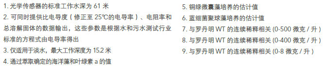 --用于水位、咸潮、養(yǎng)殖和用戶關(guān)心的溶解氧、濁度、葉綠素、藍(lán)綠藻和羅丹名的單一參數(shù)的連續(xù)監(jiān)測或者同時(shí)監(jiān)測水溫、電導(dǎo)率、pH 或pH/ORP 和快速脈沖溶解氧
