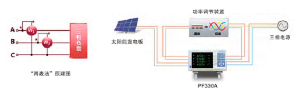 PF330A擁有三個測量通道,單臺儀器即可測量效率。其中兩通道采用“兩表法"測量逆變器的三相輸出信號,另一通道測量逆變器的直流輸入。
