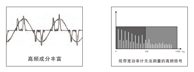 在測量正弦波時,如測試開關(guān)電源、變頻家電等輸入波形中含有豐富高頻諧波成分時,功率計的測量頻率范圍及帶寬不夠的情況下,無法測試其高頻諧波分量, PF330A系列能夠保證在測試這類產(chǎn)品時,準確測量功率及功率因素。