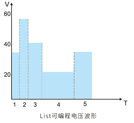 IT6100系列電源提供了高速的List模式輸出,可以使電源按照用戶編輯的序列自動輸出。通過編輯LIST操作的每一個單步的值及時間來產(chǎn)生各種輸出變化順序。