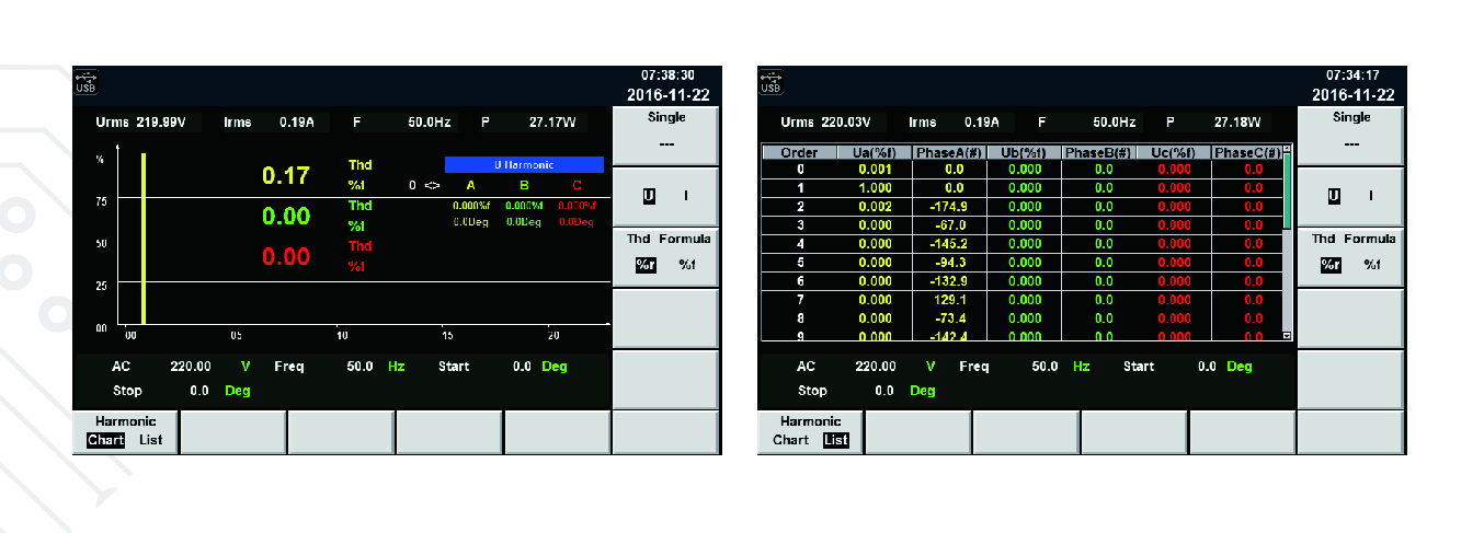 IT7600系列擁有諧波分析功能,包括電壓諧波測量和電流諧波測量。10-500Hz頻率范圍內(nèi),可以測量50次電壓和電流諧波;500Hz頻率以上,可以測量20次電壓和電流諧波。在諧波模式下可實現(xiàn)電壓和電流諧波失真因數(shù)(U/I THD)和相位的測試。此外還可進行多次諧波測量,結(jié)果以列表或柱狀圖的方式顯示,使測試結(jié)果分析更加一目了然。