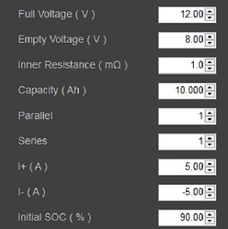 BSS2000系列電池模擬軟件提供基本的電池?cái)?shù)學(xué)模型,使用者僅需要配置簡(jiǎn)易的電池信息,軟件自動(dòng)生成對(duì)應(yīng)的電池特性曲線。參數(shù)配置包括:電池滿電壓,空電壓,額定容量,串并聯(lián)節(jié)數(shù)及電池內(nèi)阻等,對(duì)于非電池研發(fā)類的人員也能輕松實(shí)現(xiàn)電池特性仿真。