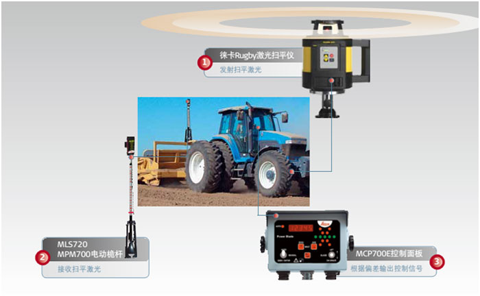 徠卡Rugby系列激光掃平儀與安裝在鏟刀桅桿上的激光接收器配合使用,將高度偏差值輸出給駕駛室內安裝的控制面板,控制面板控制液壓系統(tǒng)調整鏟刀高度實現特定高度的土地平整。