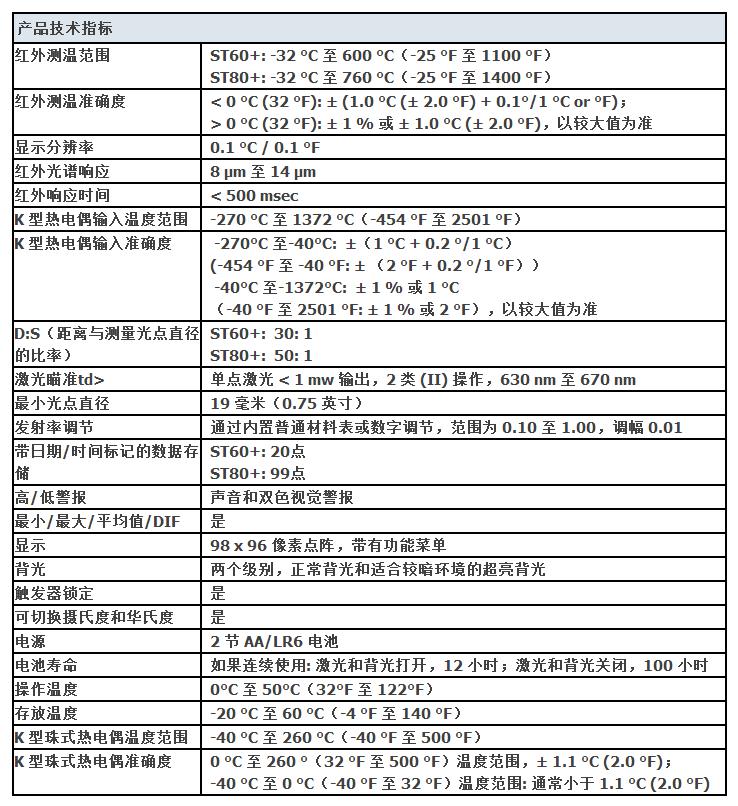 | ST80+ 和 ST60+ 的特性和優(yōu)點:測量范圍: -32°C 至 760 °C /-25 °F 至 1400 °F (ST80+),或 -32°C 至 600 °C/-25°F 至 1100 °F (ST60+)借助軟鍵按鈕和點陣式顯示屏,輕松訪問高級功能可測量距離更遠、體積更小的對象,D:S比率達 50:1 (ST80+) 或 30:1 (ST60+)兼容所有標準迷你接頭 K 型熱電偶,保留在熱電偶上的投資可調(diào)輻射系數(shù)功能(內(nèi)置材料表),讓用戶放心測量多種表面捕獲多個數(shù)據(jù)點(ST80+ 多達 99 個,ST60+ 多達 20 個)2 種級別的背光高度,輕松適應(yīng)各種光照條件聲音和視覺警報,及時提示用戶測量值是否超出了設(shè)定的極限值通過最小值、最大值、平均值和 DIF 功能快速識別問題隨附的 K 型熱電偶珠式探針便于立即進行接觸式測量1 % 的測量準確度讓用戶放心檢修設(shè)備多功能界面有 6 種語言可供選擇 |