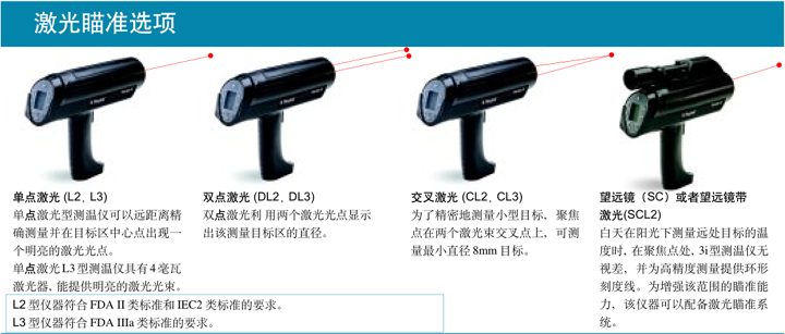 溫度可以達(dá)到1200°C。使用Raynger 3i產(chǎn)品,可有如下選擇:單激光瞄準(zhǔn)、雙激光瞄準(zhǔn)、