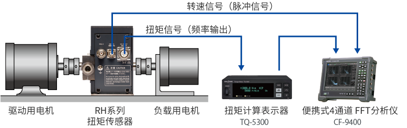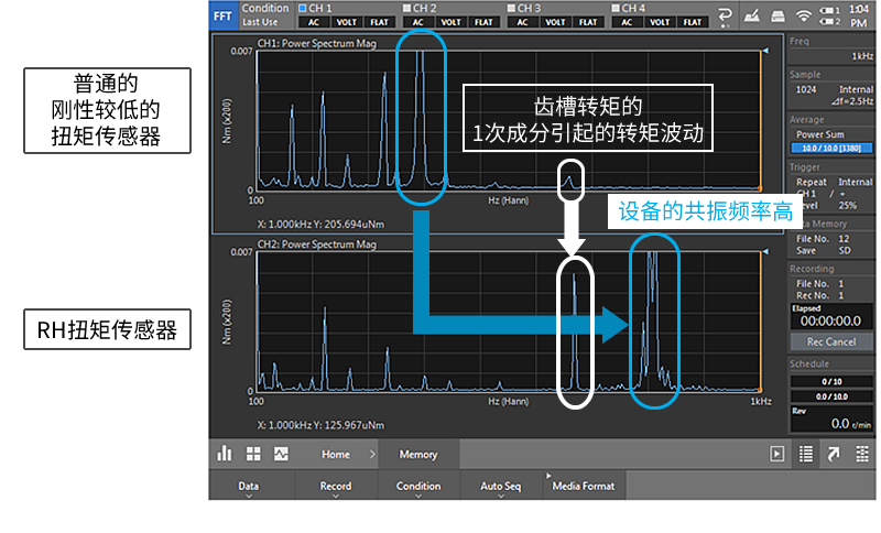 本圖為RH扭矩傳感器和和一般的低剛度扭矩傳感器通過(guò)CF-9400 FFT分析儀測(cè)量的示例。