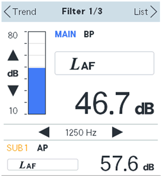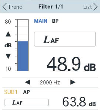 使用1/1倍頻程濾波功能確認噪聲時,在喧鬧的測量環(huán)境下,可以排除其他噪聲的干擾聽覺確認特定頻率的噪聲。 通過傳聲器的指向,可以進行聲源的探測。并且Allpass(全頻域)與 Bandpass(特定頻域)的聲壓級也可進行比較。
