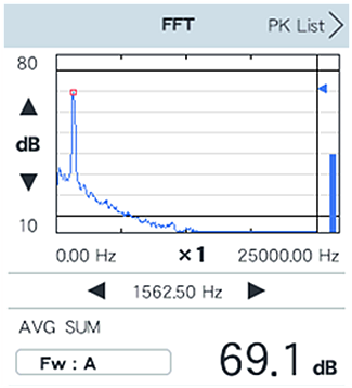 使用FFT頻譜分析功能能夠?qū)β曇暨M行狹帶域的高精度分析。通過平均處理功能,可使頻譜波形穩(wěn)定,另外通過使用觸發(fā)功能,不僅穩(wěn)態(tài)噪聲,即使是單發(fā)噪聲現(xiàn)象也可撲捉進行分析。