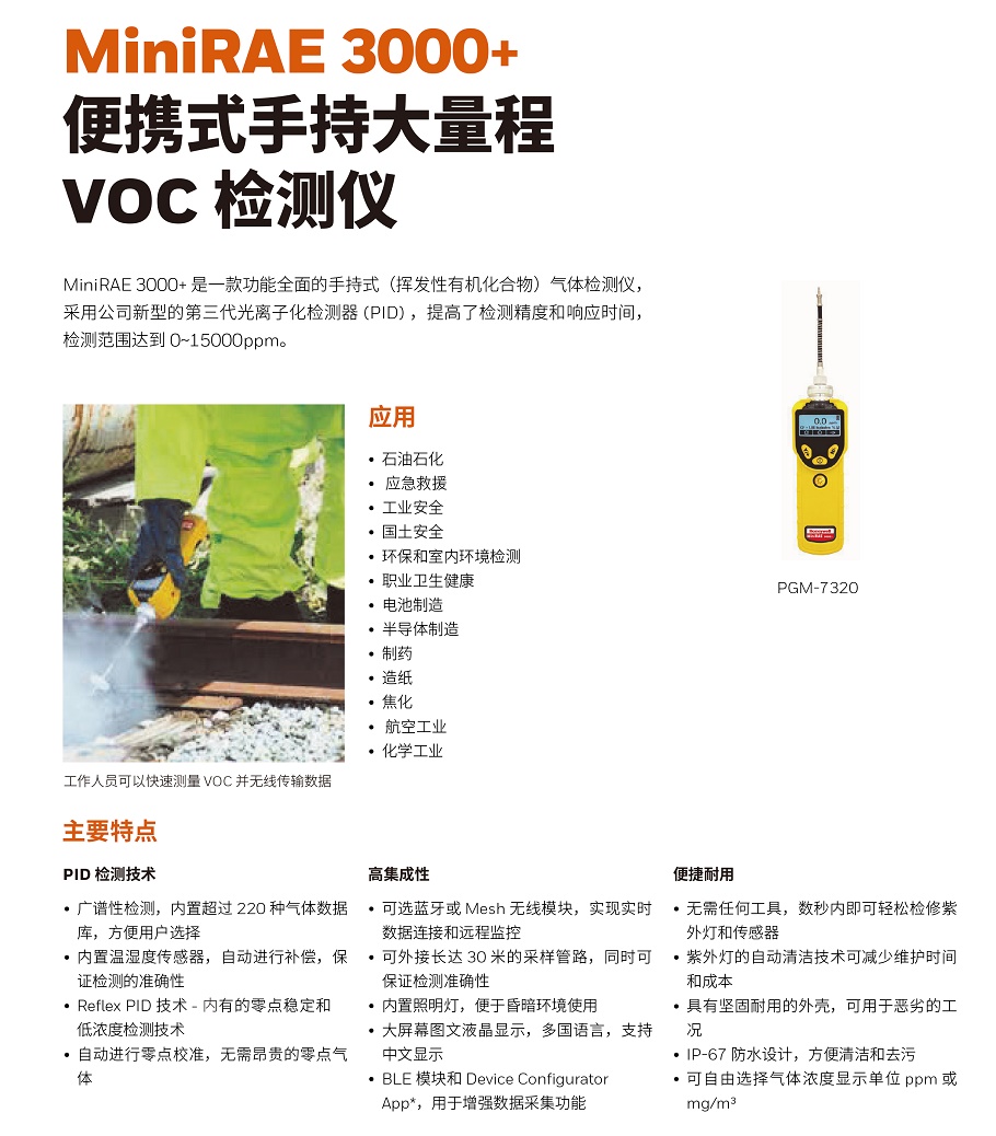 MiniRAE 3000+是一款功能全面的手持式(揮發(fā)性有機化合物)氣體檢測儀,采用公司新型的第三代光離子化檢測器(PID),提高了檢測精度和響應時間,檢測范圍達到0-15000ppm