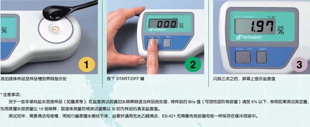 添加少量樣品至棱鏡槽→按下 START/OFF 鍵→閃爍三次之后→屏幕自動顯示鹽度值。