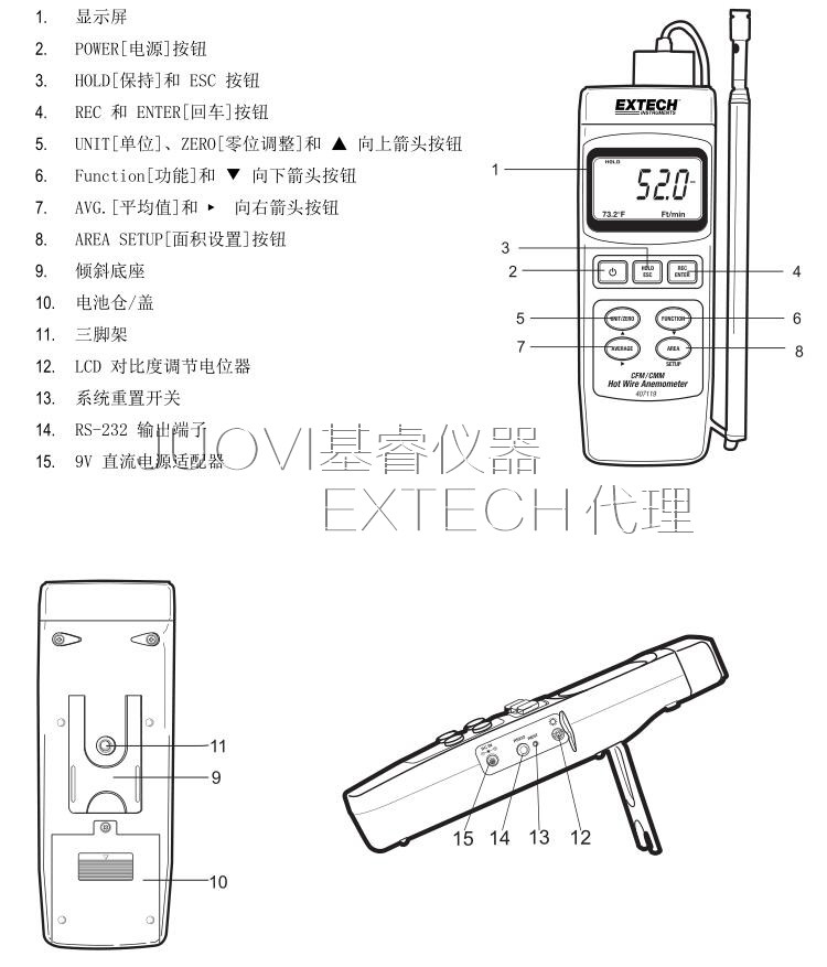 407119溫差式風(fēng)速計。407119溫差式風(fēng)速計可測量風(fēng)速、空氣量和空氣溫度。它使用伸縮式探針天線,能夠很方便地探入格柵和擴(kuò)散器。小心使用該儀表將使您常年享受其可靠服務(wù)。407119 A 型風(fēng)速計具有下列功能。