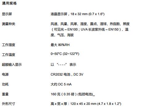 具有以下參數(shù)測(cè)量能力:風(fēng)速、風(fēng)量、風(fēng)寒、濕度、露點(diǎn)、濕球、熱指數(shù)、照度(可見(jiàn)光 –EN100)、溫度、氣壓、海拔