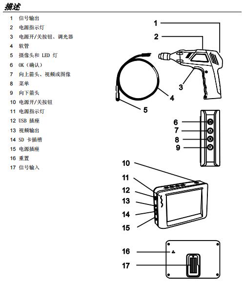 BR250 型(9mm 攝像頭)視頻內(nèi)窺鏡。該儀表是一款遠程檢驗裝置。可用于檢查空間狹小的部位,并提供可以記錄的實時視頻和圖像。典型的適用范圍包括 HVAC(暖通空調(diào))檢驗、汽車檢驗、電纜敷設(shè)和機動車/船舶/飛機檢驗。該儀表在交付前均經(jīng)過完整測試,只要妥善使用,您便可常年享受其可靠服務。
