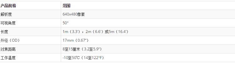 BR-17CAM-5M 17mm鏡筒相機頭,帶有用于Extech內(nèi)窺鏡型號BR100,BR150,BR200和BR250的電纜。196.8英寸(5m)電纜長度,最小彎曲半徑為2.36 in。50度視角。5.9到9.8英寸的焦距。防水(IP67),帶2個明亮的LED,帶調(diào)光器。