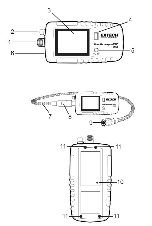 1. 電源開關(guān): 按住電源按鈕, 顯示器將照亮內(nèi)部電池充電。再次按住電源按鈕以關(guān)閉視頻內(nèi)窺鏡。