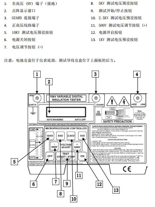 2. 測試電壓在通電時默認(rèn)為 2500V。使用電壓調(diào)節(jié)按鈕 (±500V) 每次將測試電壓增加500V或按下其中一個預(yù)設(shè)測試電壓按鈕(10kV、5kV、2.5kV、1Kv)來選擇所需測試電壓。