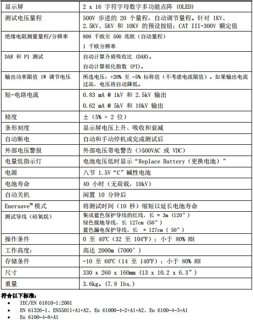 MG500是一款數(shù)字高壓絕緣測試儀,可測試高達(dá)10kV的電壓,并測量絕緣電阻為500GOhm。MG500具有CAT III 300 Volt安全等級。本產(chǎn)品配有一年保修,內(nèi)置重型手提箱,蓋子,測試線,鱷魚夾和8 x C電池。