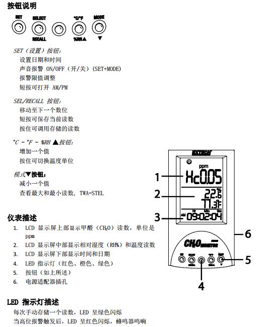 報警觸發(fā)期間,LED 將呈紅色閃爍,無論是否已選擇“蜂鳴聲關閉”。報警狀態(tài)下要想消除蜂鳴聲,請同時按 SET 和 MODE。紅色 LED 將繼續(xù)閃爍,直至環(huán)境甲醛濃度不再超過默認值,即報警值 0.08ppm 或是用戶選擇的報警值。日后使用時切記要重啟蜂鳴器。