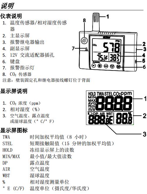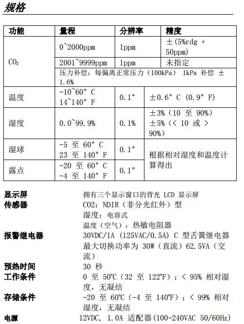 LCD 顯示屏可同時(shí)顯示 CO2 濃度、相對濕度和溫度(空氣溫度、露點(diǎn)溫度或濕球溫度)