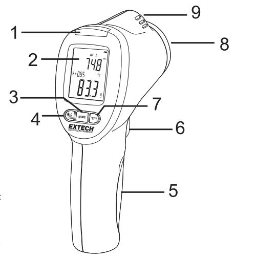3. 對(duì)于表面溫度測(cè)量, 點(diǎn)計(jì)朝向正在測(cè)試的表面。較低的顯示數(shù)字顯示測(cè)試表面的溫度。為精確瞄準(zhǔn), 使用雙紅色激光指針 (背光/激光器指針按鈕打開或關(guān)閉指針開關(guān)。ir傳感器有一個(gè) 12:1 distance‐to‐spot 比率 (見陪同"視圖字段" 圖表。例如, 在30cm 的距離,實(shí)測(cè)的光斑尺寸為2.5cm。