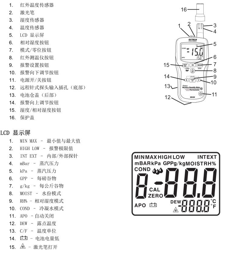 測量濕度,空氣溫度(內(nèi)置探頭)加非接觸式紅外溫度