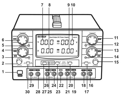 382270是一個四輸出直流電源有兩個0到30V / 0到5A輸出加上3到6.5V / 3A和15V / 1A的兩個固定輔助輸出。兩個30V輸出可并聯(lián)組合為10A或串聯(lián)組合為60V。配有4對測試導線(香蕉插頭和鱷魚夾)和一條交流電源線。