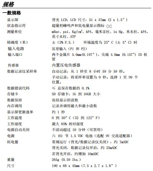 SDL710 型壓力計。該設(shè)備測量壓力表和±2.9 psi 范圍內(nèi)的壓差。支持的測量單位包括 mbar、psi、Kg/cm2、毫米汞柱、英寸汞柱、米水柱、英寸水柱、標準大氣壓力、hPA 及 kPA。記錄的數(shù)據(jù)讀數(shù)保存在 SD 卡中,以便傳輸?shù)?PC。該儀表在交付前均經(jīng)過完整測試及校準,若使用得當,可提供多年可靠的服務(wù)。