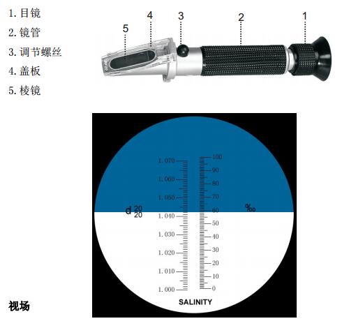 2.樣品準(zhǔn)備和測量讀數(shù)要獲取讀數(shù),須在測量棱鏡上滴幾滴樣品液體。確保棱鏡充滿足夠液體,以全面覆蓋棱鏡。關(guān)閉棱鏡確保液體均勻分布在棱鏡的整個表面,避免氣泡或干點出現(xiàn)(參見下圖)。允許樣品在棱鏡上停留 30 秒左右。將儀表放在一個光源下,通過目鏡觀察。鹽度通過標(biāo)記刻度尺上的明暗界限(通常稱為陰影線)交叉點測定。刻度尺的左側(cè)指示指定比重,右側(cè)指示千分比。如果刻度尺出現(xiàn)失焦,可通過旋轉(zhuǎn)滾花手輪調(diào)節(jié)目鏡。儀表還配備