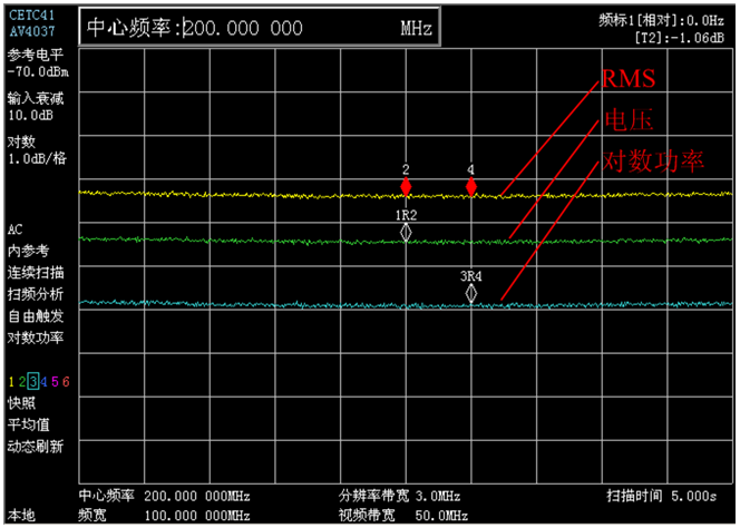 本產(chǎn)品提供多達(dá)6條顯示軌跡和12個頻標(biāo)。支持用戶同時激活多條軌跡、并選擇不同的視頻檢波方式對信號進(jìn)行同步測試。本產(chǎn)品的頻標(biāo)功能靈活,支持用戶在多條軌跡上同時激活多個頻標(biāo),并支持跨軌跡的頻標(biāo)互為參考,進(jìn)行相對參數(shù)測量。