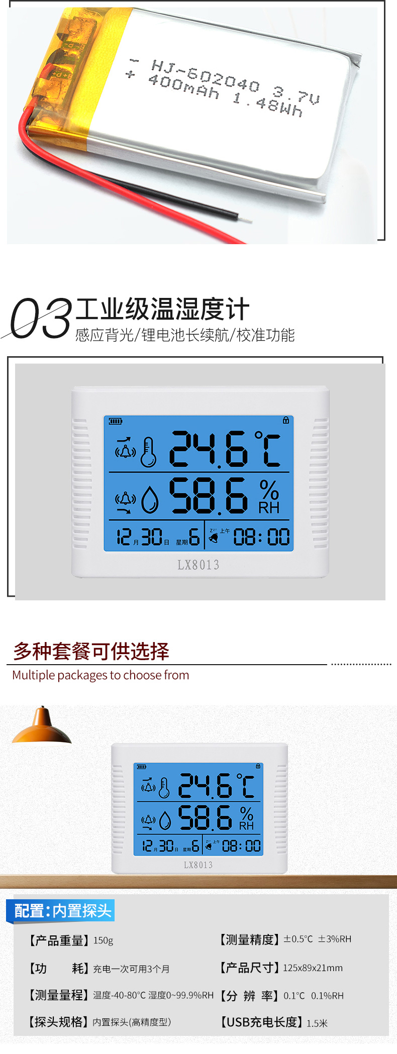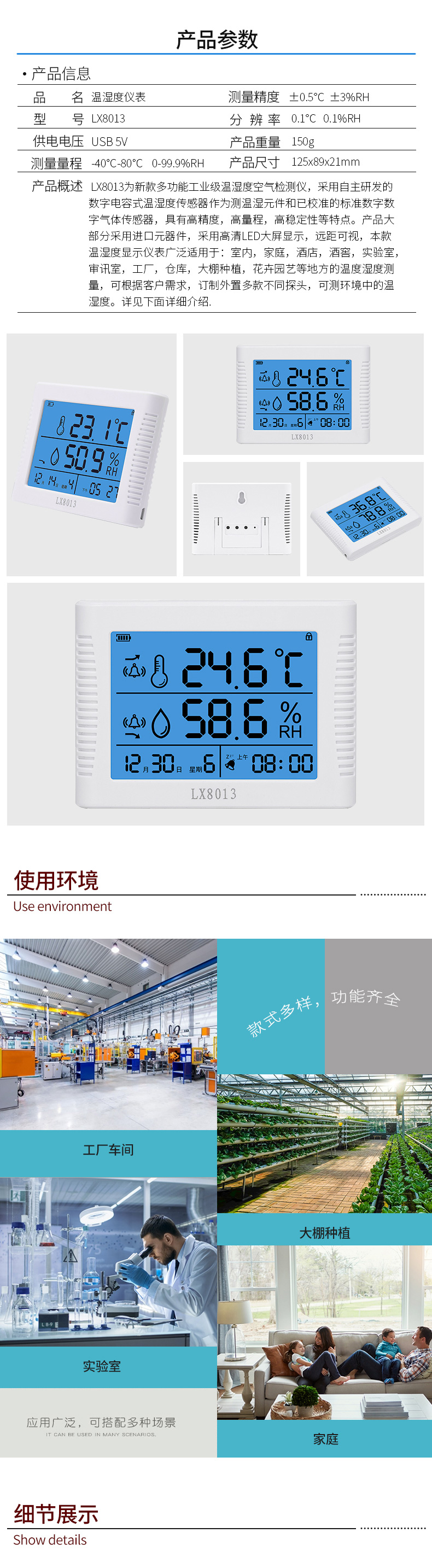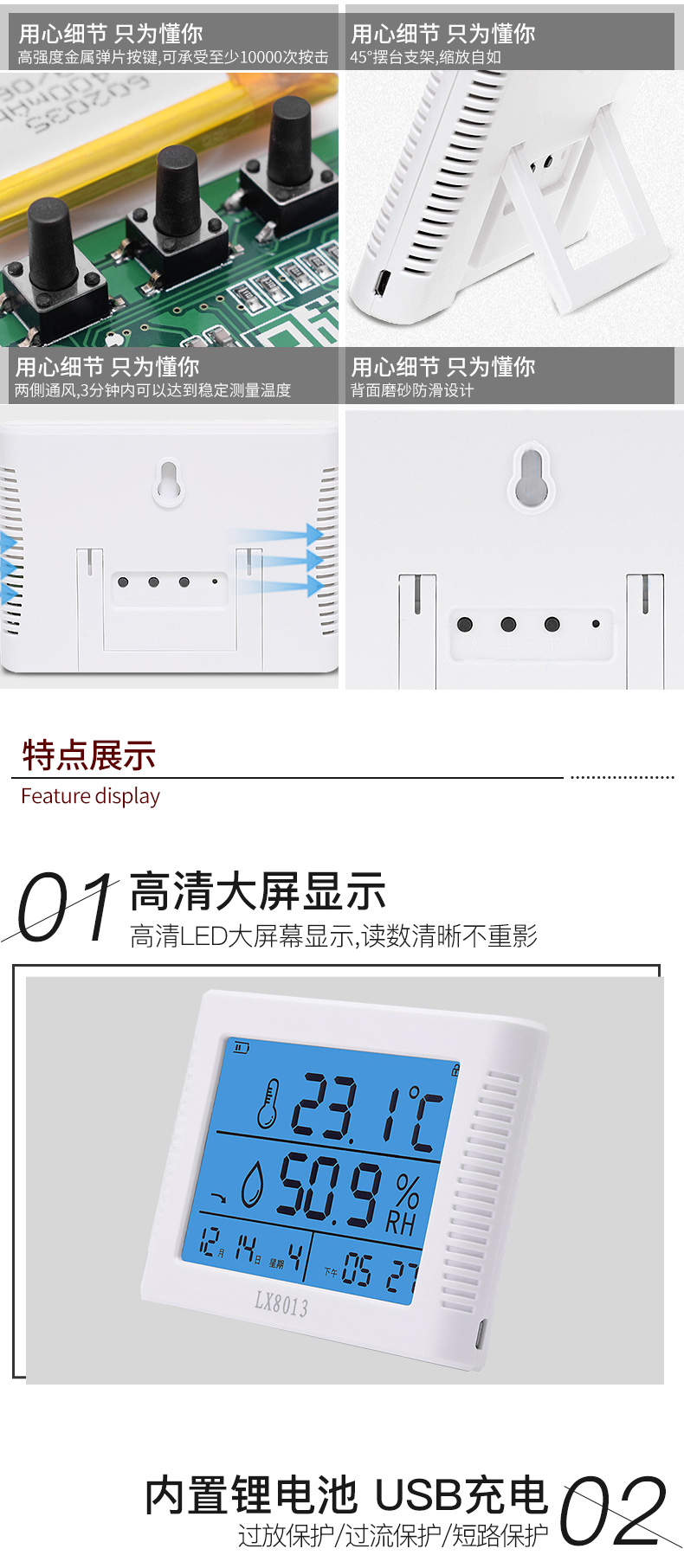 LX8013溫濕度顯示儀主要用于家庭或個(gè)人用的溫濕度顯示儀,具有反應(yīng)速度快、測量精度高、穩(wěn)定性好、實(shí)用性強(qiáng)等特點(diǎn),產(chǎn)品帶有溫濕度報(bào)警、時(shí)間、鬧鐘、溫濕度校準(zhǔn)、℃/℉切換、恢復(fù)出廠設(shè)置等功能。產(chǎn)品采用工業(yè)級高精度溫濕度傳感器做測溫濕元件,進(jìn)口精密線路板等元件制作.