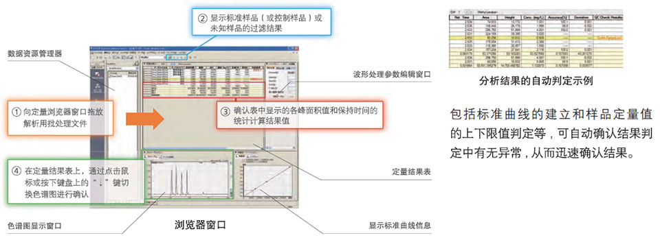 ■ 瀏覽器功能:可對色譜峰積分、繪制標準曲線等定量處理所需的操作進行統(tǒng)一處理