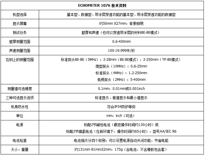 ● 測(cè)量范圍為ECHOMETER1076涵蓋范圍從0.6至400毫米的壁厚(取決于探頭)