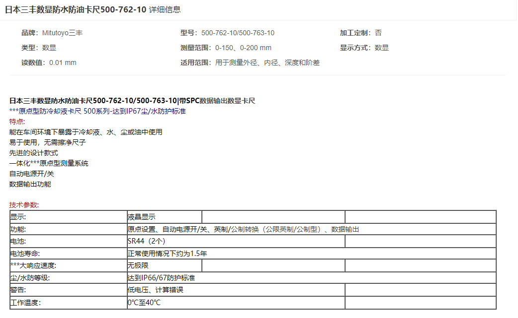 本網(wǎng)頁所展示的有關(guān)【三豐 500-762-10 數(shù)顯防水防油卡尺】的信息/圖片/參數(shù)等由的會員【日本三豐mitutoyo-深圳柏萊科技有限公司 】提供,由柏萊儀器網(wǎng)-專業(yè)銷售儀器儀表服務(wù)商-深圳柏萊科技有限公司會員【日本三豐mitutoyo-深圳柏萊科技有限公司 】自行對信息/圖片/參數(shù)等的真實性、準(zhǔn)確性和合法性負(fù)責(zé),本平臺(本網(wǎng)站)僅提供展示服務(wù),請謹(jǐn)慎交易,因交易而產(chǎn)生的法律關(guān)系及法律糾紛由您自行協(xié)商解決,本平臺(本網(wǎng)站)對此不承擔(dān)任何責(zé)任。您在本網(wǎng)頁可以瀏覽【三豐 500-762-10 數(shù)顯防水防油卡尺】有關(guān)的信息/圖片/價格等及提供 【三豐 500-762-10 數(shù)顯防水防油卡尺】的商家公司簡介、聯(lián)系方式等信息。